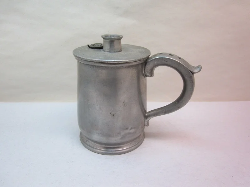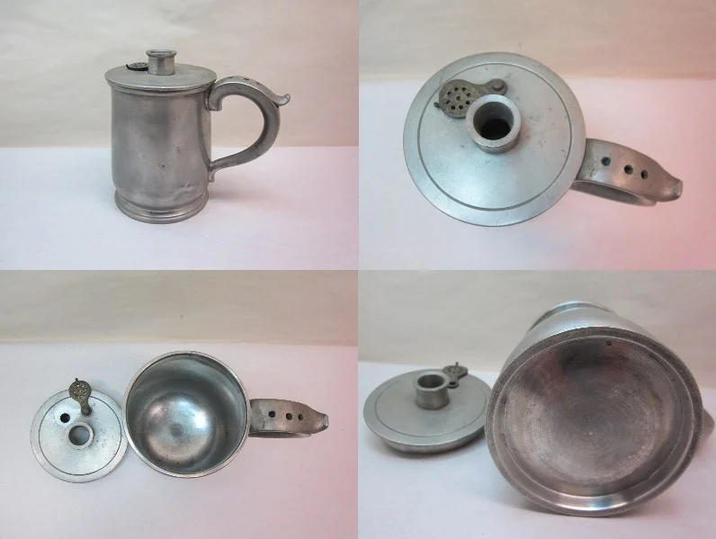 i am pleased to offer this unmarked but nicely made 'u' shaped infusion pot. it is from the second half of the eighteenth century and probably london made. these would have a flexible breathing tube attached to the nozzle. the lid pocket would be filled with an aromatic substance and the bottom would hold hot water. breathing the vapors helps people inflicted with lung problems. the piece is in very good condition.