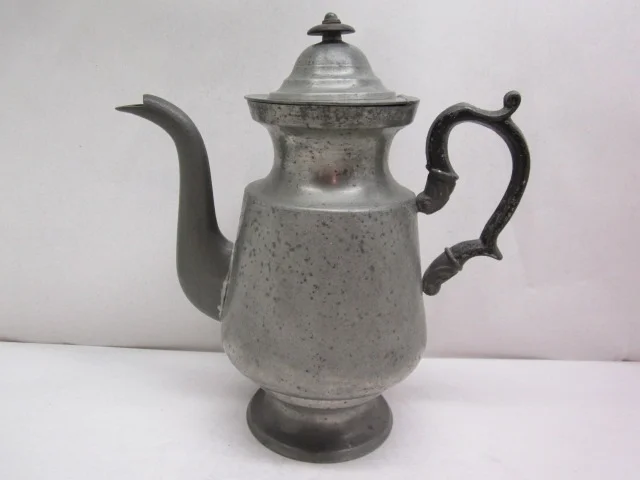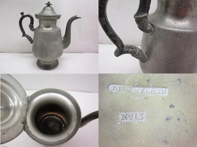 offered is this as found all original josiah danforth coffeepot. it stands 10 3/8" tall and still has coffee stains inside. the finial is wood and the handle retains much of its original black paint. the condition is good with minor eruptions/pitting. the bottom is marked "j. danforth" and "No.13".