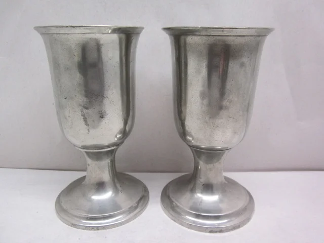 here is a nice pair of church chalices made by leonard, reed and barton of taunton, massachusetts 1837 to 1840. they stand 7" tall and are in very good as found condition.